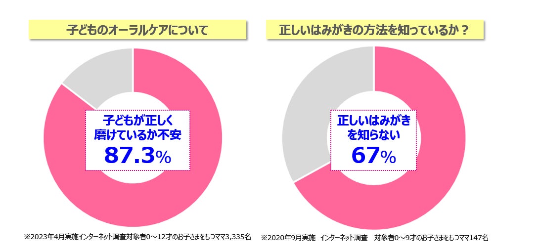 子どもが正しく歯を磨けているか不安に感じているママは87.3%と、とても多いですが、一方で正しいはみがきの方法を知らないというママも67%いる現状です。