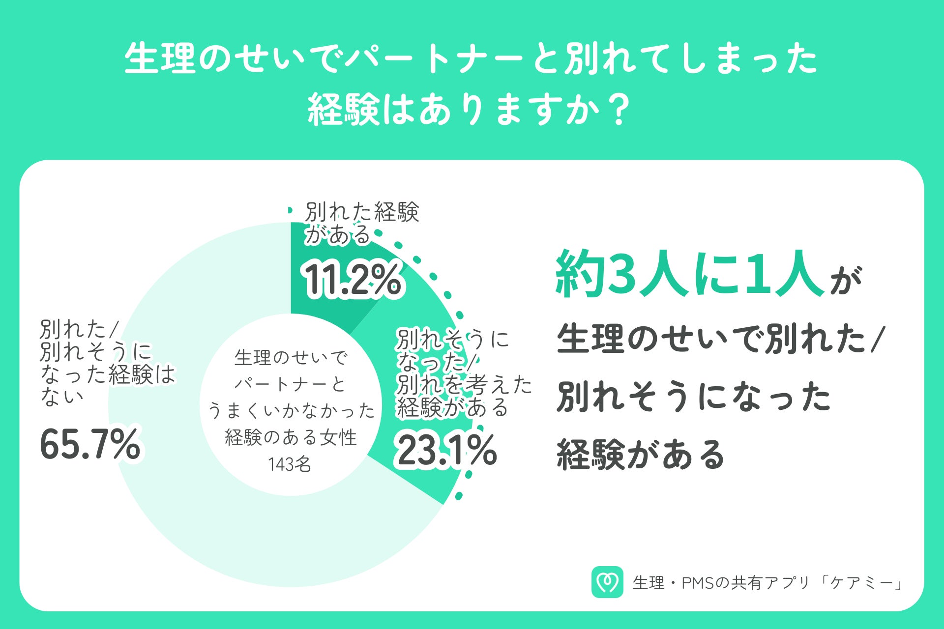 女性の約3割が「生理のせいで、パートナーとの関係がギクシャクしたり、険悪なムードになったり、喧嘩になった経験がある」と回答。さらにそのうちの約3人に1人が「別れを考えた」「別れそうになった」「別れた」と回答し、生理による影響がカップルの関係に深刻なダメージを与える可能性があることが分かりました。