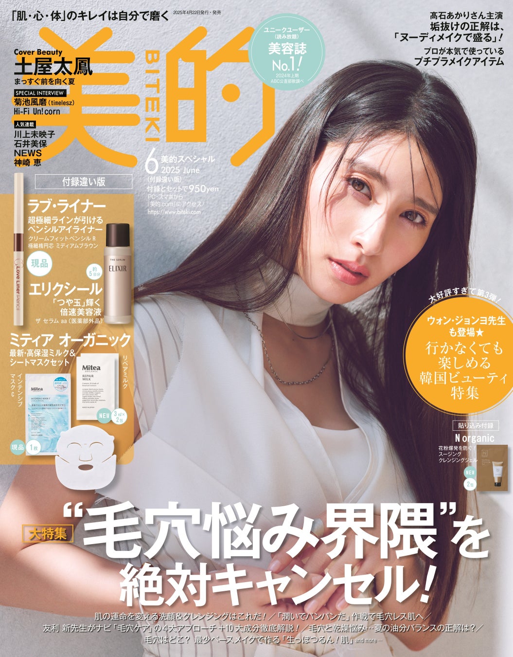 今号も超豪華付録がついてきます! ラブ・ライナーの現品アイライナー、ネーミングの大人ピンクチークのランダム現品、ウォンジョンヨへアのヘアケアセット現品などうれしい現品付録のほか、トランシーノやミノン アミノモイストのマスク、エリクシールの美容液など、「通常版」「付録違い版」「豪華韓国付録BOX版」の3バージョンで異なる付録が目白押し&共通貼り込み付録はN organic スージング クレンジングジェル!付録がつかないSPECIAL EDITIONの表紙には、timeleszの菊池風磨さんが初登場します。『美的』6月号は4月22日(火)発売♪