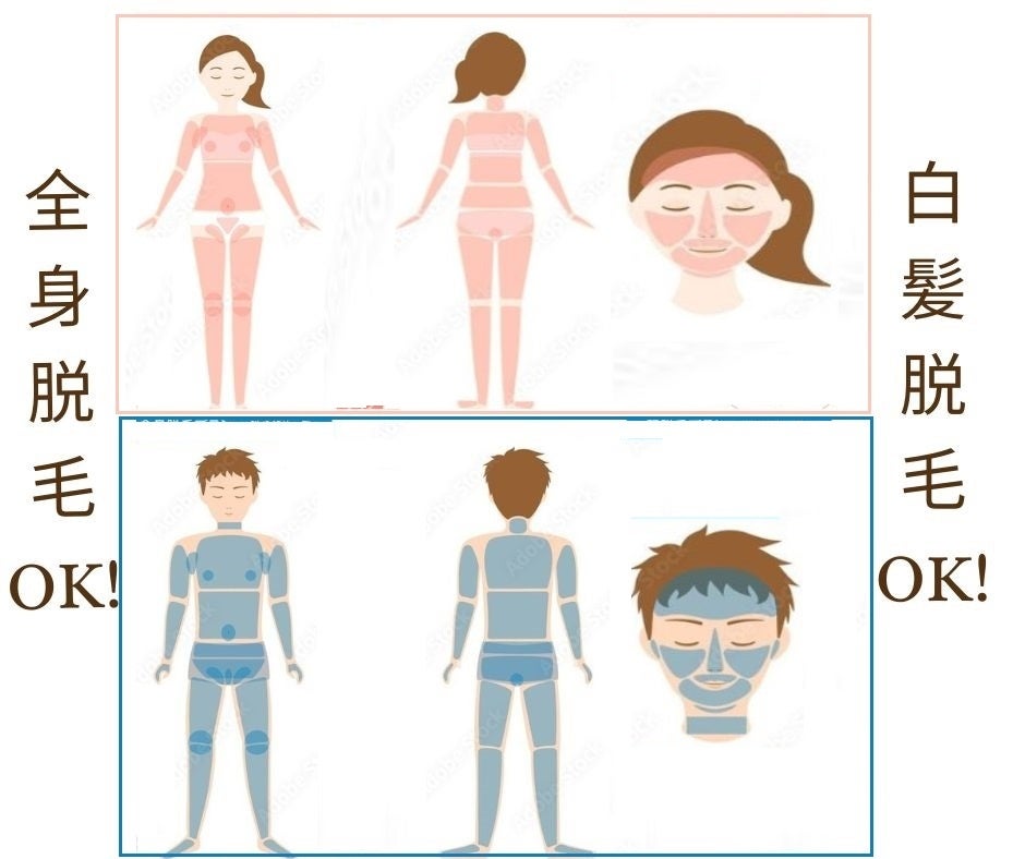 さらに、顔まわり(フェイスライン・口元・眉毛)やうなじ・えりあしなどの細かな部分から、脇・ひじ下・ひざ下・背中・お腹・胸・肩・指・足の甲などのボディパーツまで幅広く対応。