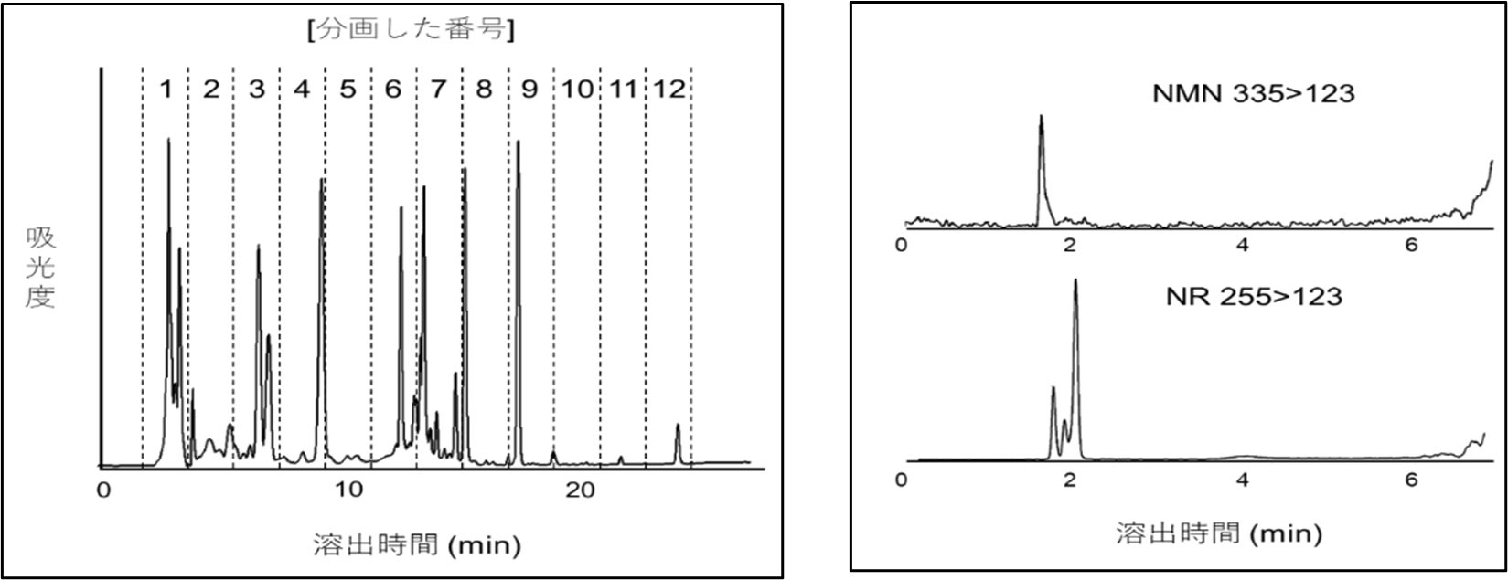 限外ろ過※4を使った予備検討により、上記の効果を持つプラセンタの有効成分が3 kDa未満の低分子を含む画分に含まれていることが分かりました。そこで、その画分をさらに逆相HPLC※5を使って12の画分に分離し(図3)、唯一活性が見られた3の画分をLC-MS/MS※6を使って解析した結果、NMN※7やNR※8が含まれていることが分かりました(図4)。