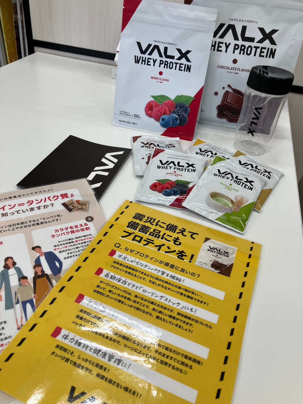 VALXは、展示スペースにて避難生活で不足しがちなタンパク質を手軽に補える商品として、プロテインを紹介させていただきました。