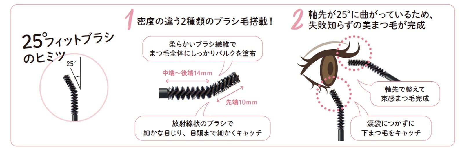 束感カールロック処方で長時間きれいな上向きロングまつ毛をキープします。軸先が25°に曲がった25°フィットブラシを採用することで、重ね塗りしてもダマにならず簡単にボリュームのある束感まつ毛が完成します。