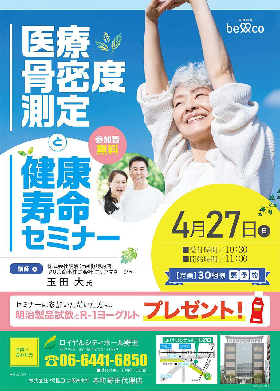 株式会社ベルコ(本社:大阪市北区)は、2025年4月27日(土)に、大阪市の「ロイヤルシティホール野田」にて、地域住民の皆さまを対象とした健康応援イベント「骨密度測定と健康寿命セミナー」を開催いたします。