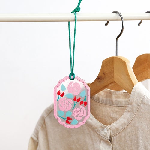 ステンドグラスをイメージした装飾が美しい吊り下げタイプの芳香剤。バラの実と花の香りがふんわり広がります。