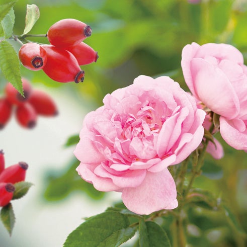バラの花が咲いた後になる果実。ほんのり甘酸っぱい爽やかな香りが特徴です。ビタミンCを豊富に含み、その形から「ビタミンCの爆弾」と呼ばれます。ローズヒップから抽出されるオイル(*1)やエキス(*2)は肌をうるおし、美しい肌を保つのに役立ちます。