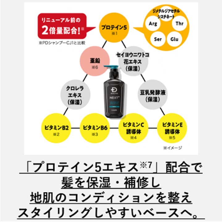髪を構成するアミノ酸上位5種を独自バランスで配合した「プロテイン5エキス※7」で髪を保湿・補修。また、8種の厳選成分が地肌のコンディションを整え、スタイリングしやすいベースへ。