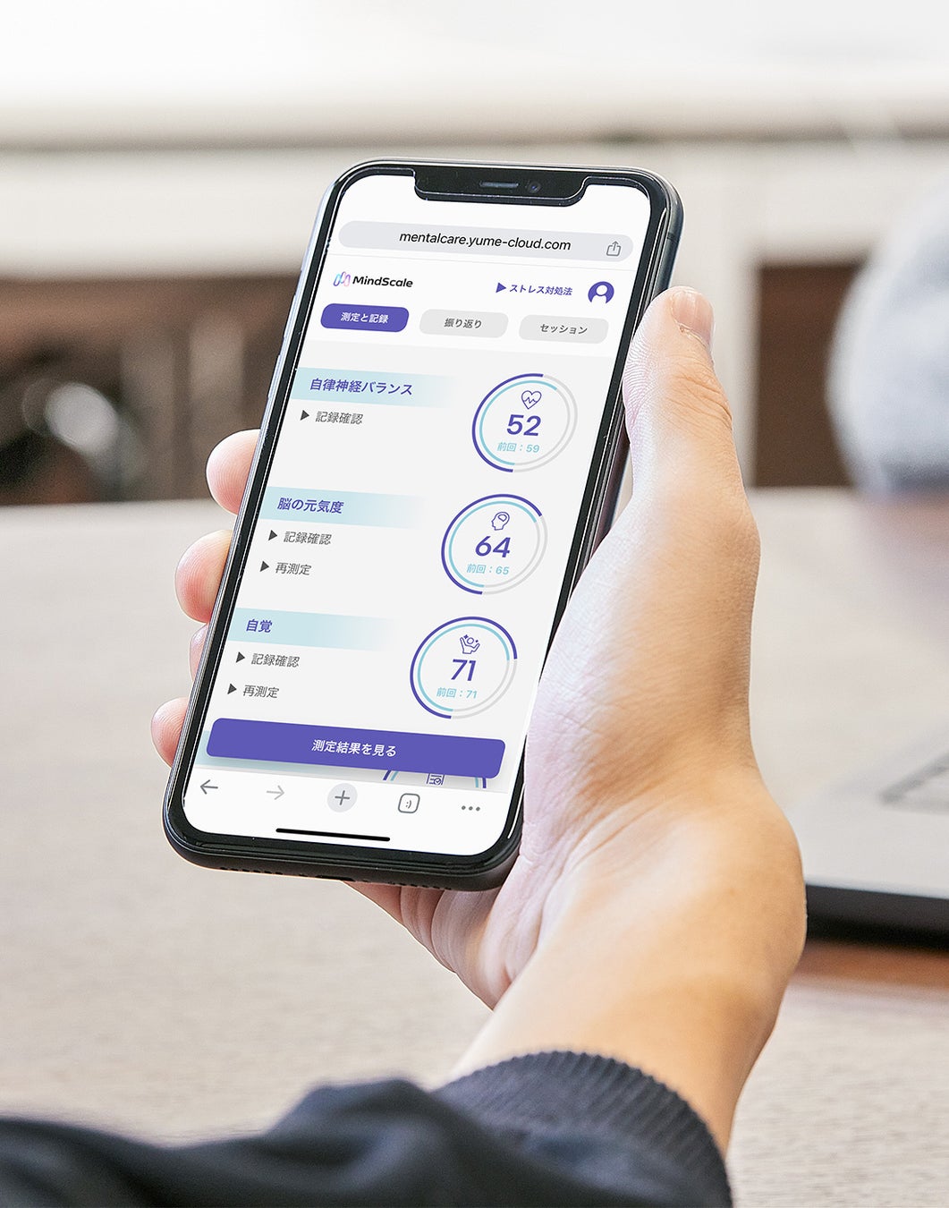 Yume Cloud Japanのマインドスケールは、ストレスチェックとのセット利用が可能です。自己申告のストレスチェックだけに留まらず、生体データによってメンタル状態を数値化し、その後の見守りやストレス対処法の習得をワンストップで提供する業界初のメンタルケアサービスとして、企業様の健康経営を支援します。