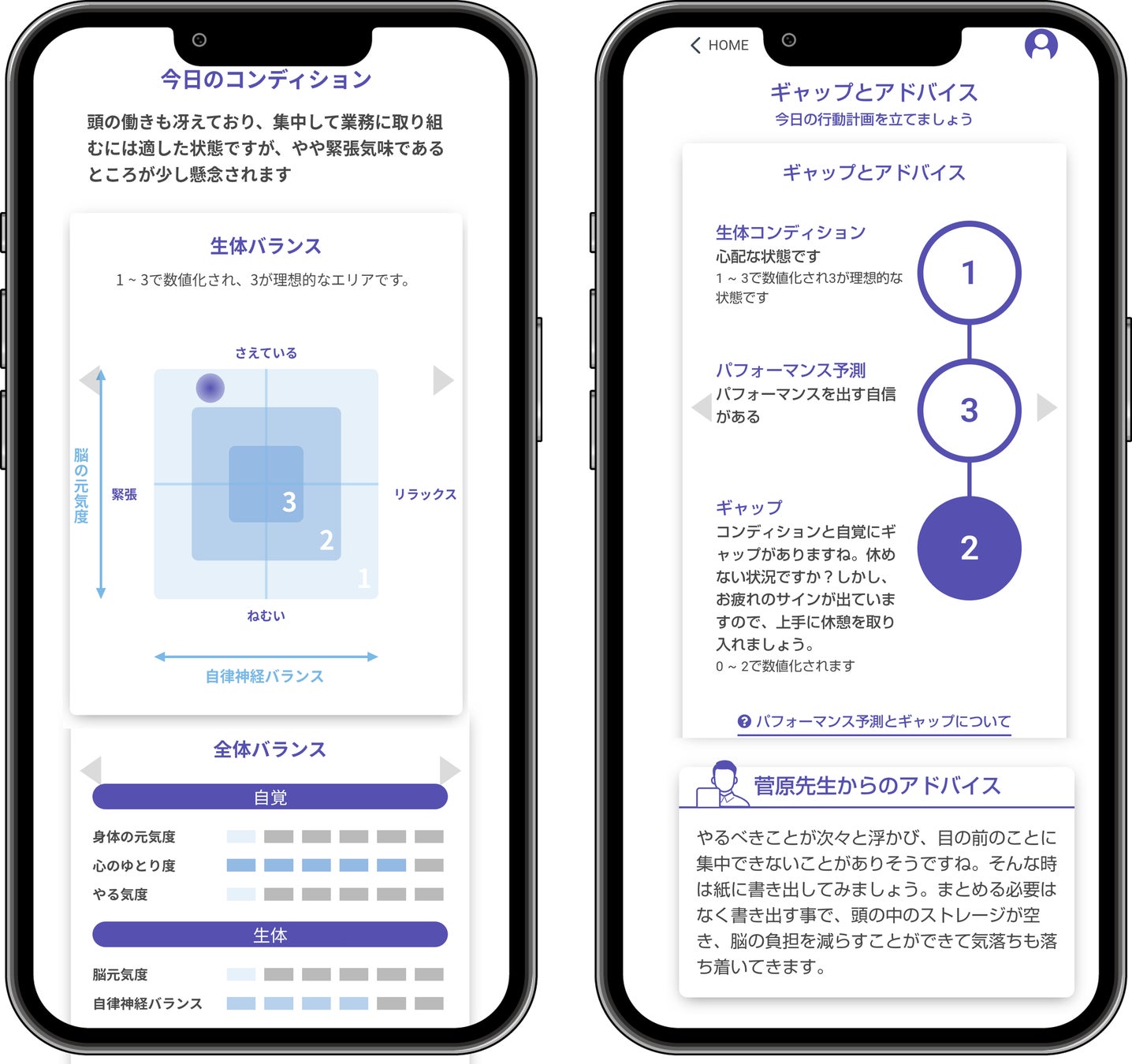 【開発の背景】これまでのマインドスケールでは、独自に開発した技術により、さまざまな生体データ測定(脈波=自律神経、朗読=脳疲労度、表情=気分)と自覚によってストレスを可視化し、測定結果を分析して改善をサポートしてきました。しかし、ご自身が感じる体調は実際の体調と違っていることがあり、自分が感じている以上に体調が悪い場合でも無理をしてしまい本来の力を発揮できないことや、効率的に対処できなくなることがあります。Yume Cloud Japanでは、この生体データによる体調と自覚の「ギャップ」に着目し、菅原洋平先生の監修のもと、最も効率の良い行動プランをアドバイスし、パフォーマンスを最大限ひき出せるような「マインドスケール・メソッド」の開発に着手しました。