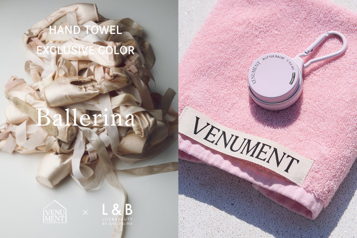 昨年「Life&Beauty by JUN ONLINE」での取り扱いを皮切りに日本上陸を果たした、韓国発ライフスタイルビューティーブランド〈VENUMENT|ベニュメント〉とのコラボレーションが実現。日本上陸時から好評のハンドタオルから、別注カラーのピンクが登場します。柔らかい色合いは、ブランドを象徴するプロダクト「BUTTER BALM」のBALLERINAカラーからインスパイアされたもの。フックにかけて使用できるロゴプリントのラベルもポイントです。