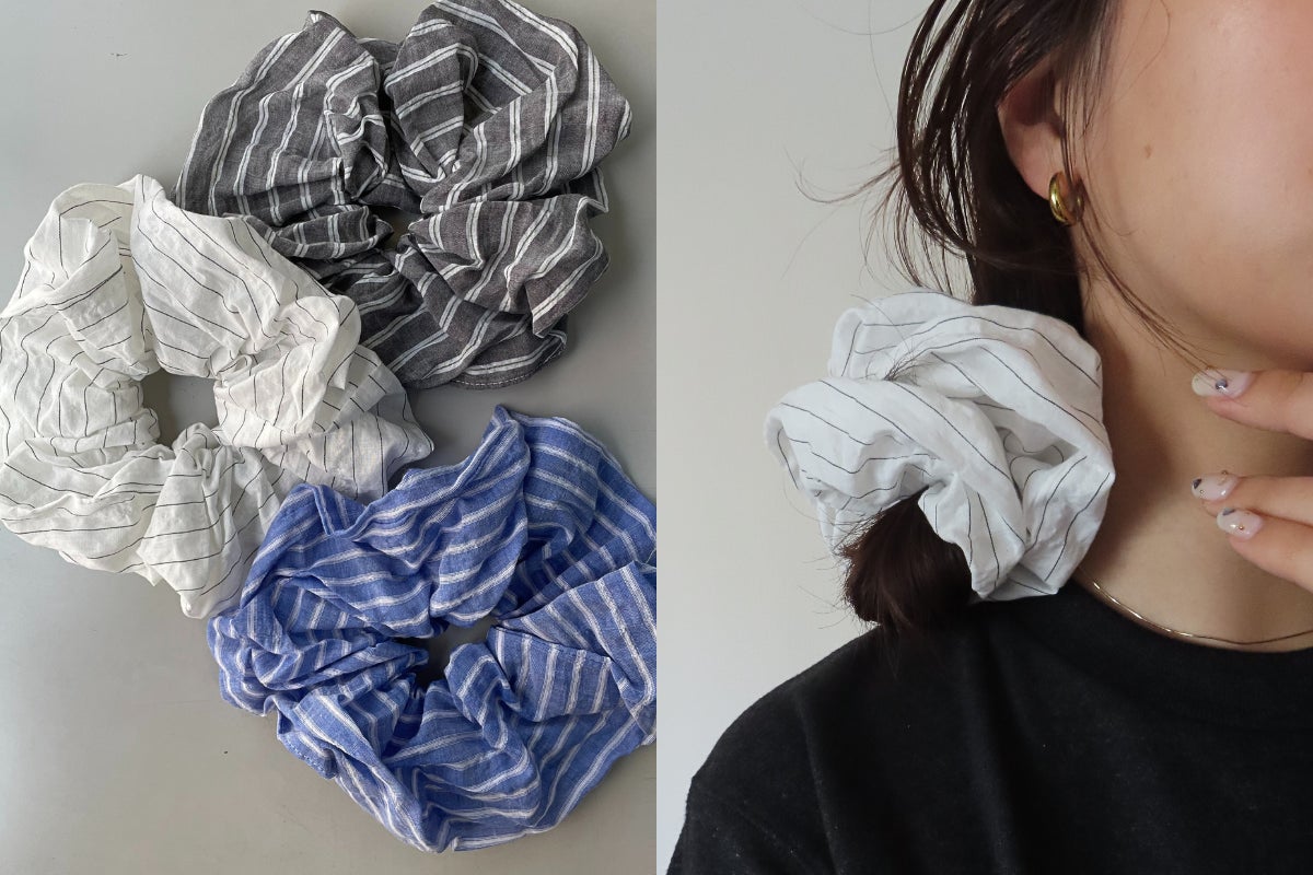 シャツのファブリックで使用する柔らかなストライプ生地で、シュシュを制作しました。目に留まるボリューム感と、数ある中から選び抜いたこだわりのストライプ柄、洗いざらしのラフな風合いが夏に映えるプロダクトです。
