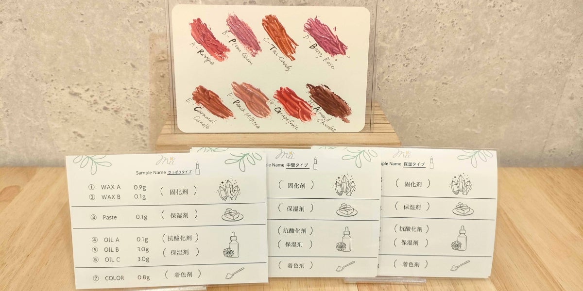 内容:3種の質感から好きな感触を選び、色味を調合して1本のオリジナルリップを作成