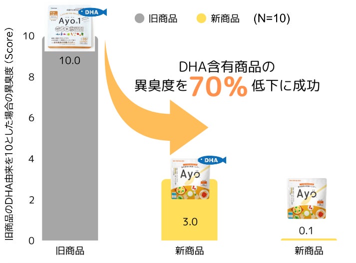 特にDHA配合タイプ「Ayo®1」は、DHAを手軽に補えることから高い支持を得てきましたが、一部のお客様から「魚の匂いが気になる」といった声が寄せられていました。そこで当社が製造工程で生じるDHA匂いを抑える手法の開発に取り組んだ結果、旧商品と比較して匂いを約70%低下(図1)することに成功し、今回のリニューアルに至りました。