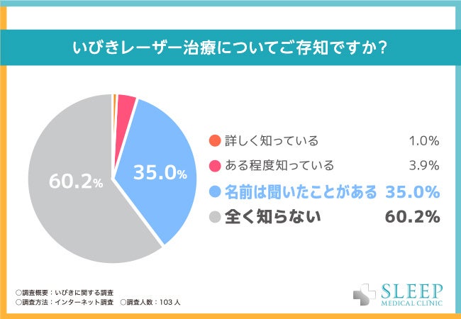 最後に「いびきレーザー治療についてご存知ですか?」と質問したところ、「全く知らない」が60.2%で最多回答数、「名前は聞いたことがある」が35.0%で、続いて「ある程度知っている」が3.9%となりました。
