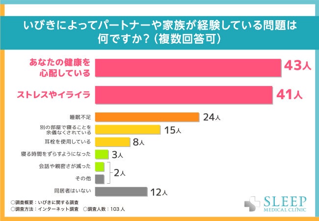 ・いびきによってパートナーや家族が感じている問題の第1位は「あなた(いびきをかいている人)の健康を心配している」(43人)