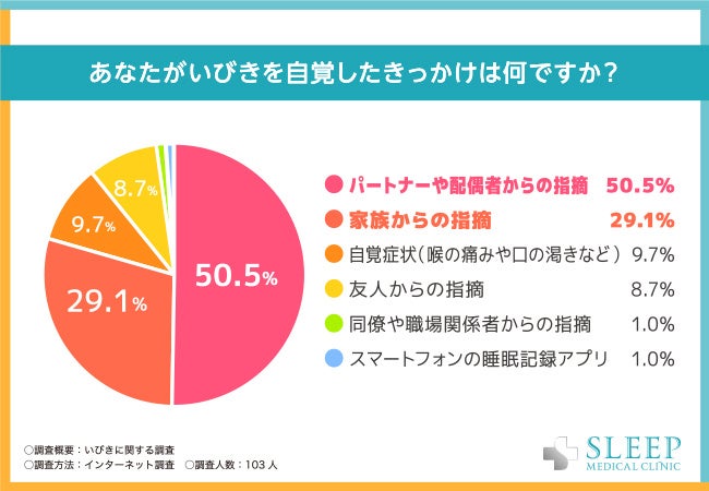 初めに「あなたがいびきを自覚したきっかけは何ですか?」と質問したところ、最も多かった回答は『パートナーや配偶者からの指摘』(50.5%)でした。次いで、『家族からの指摘』(29.1%)、『友人からの指摘』(8.7%)と続いています。