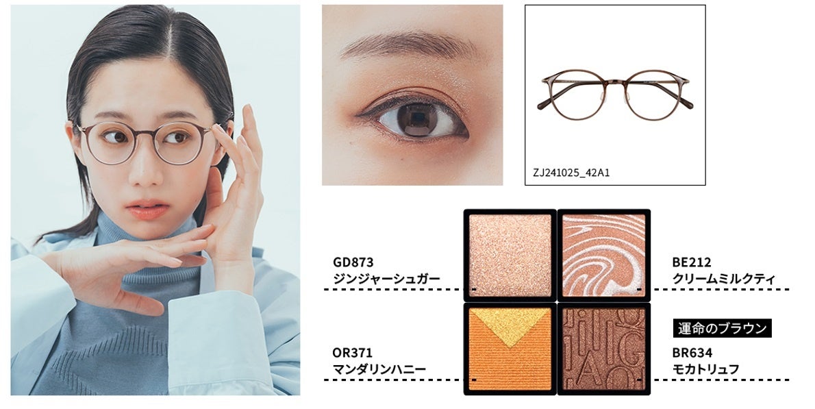 資生堂ヘアメイクアップアーティストが組み合わせを考案した、瞳の色になじむ「運命のブラウン」を含むアイシャドウ4色と、それにぴったりなメガネフレーム。