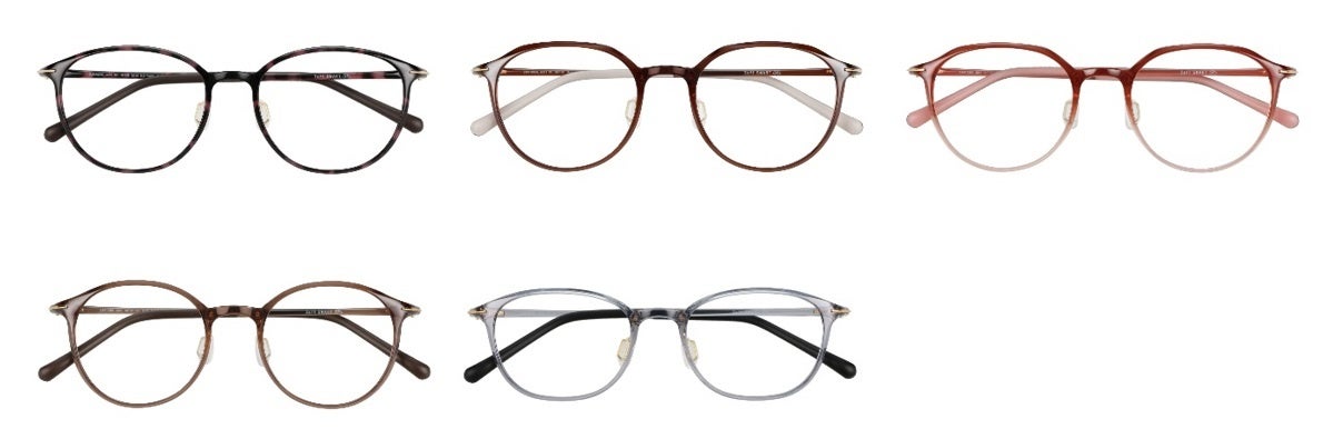 「Zoff SMART SKINNY JEWELRY」シリーズからは、肌なじみの良い繊細なカラーリングの5種類――「ピンクデミ」「イエローブラウン」「レッドグラデーション」「レッドブラウン」「クリアグレー」のフレームをセレクト。