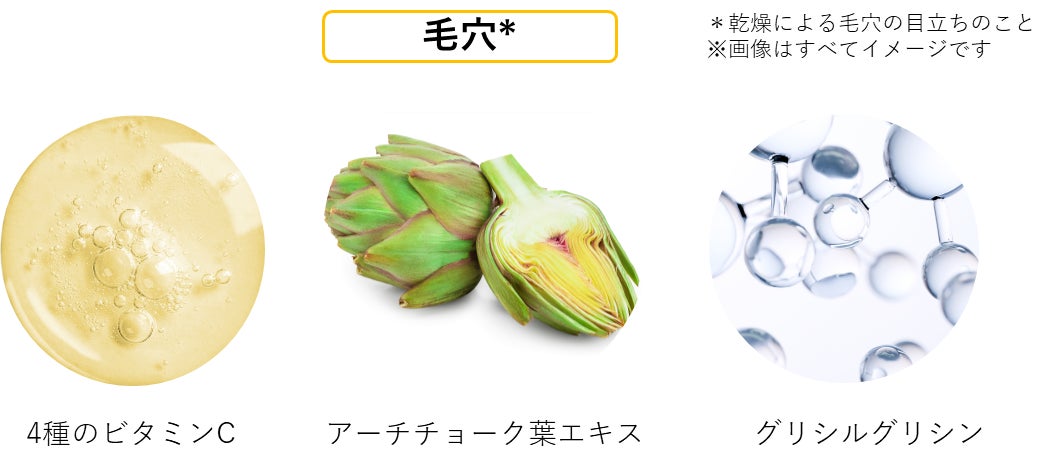 毛穴へのアプローチに特化した「iVC®MGA※3」をはじめ、持続型の「VCIP※4」、浸透型の「VCエチル※5」、および角層深部までビタミンの浸透をサポートする「iVC®GCA※6」の4種のビタミンC誘導体を配合。そのほか、開き毛穴にアプローチ※7する「アーチチョーク葉エキス※8」と、毛穴ケアの注目成分「グリシルグリシン※8」を配合。