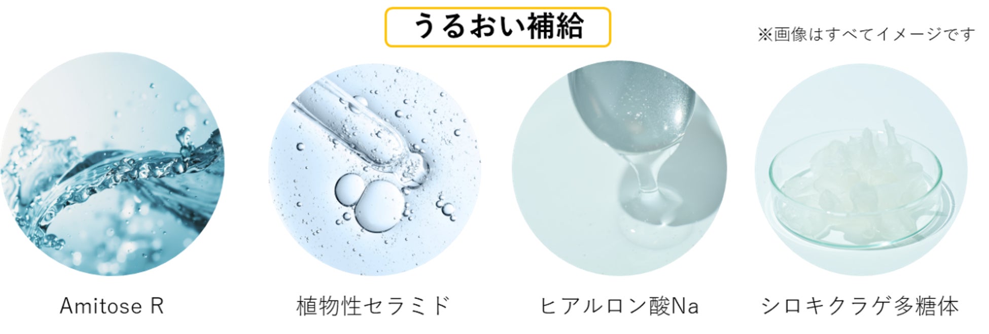 Amitose R※11、植物由来セラミド※12、ヒアルロン酸Na、シロキクラゲ多糖体の厳選した保湿成分を配合。あふれるようなツヤ感と、ふっくらとしたハリ感のある水光肌へと導きます。