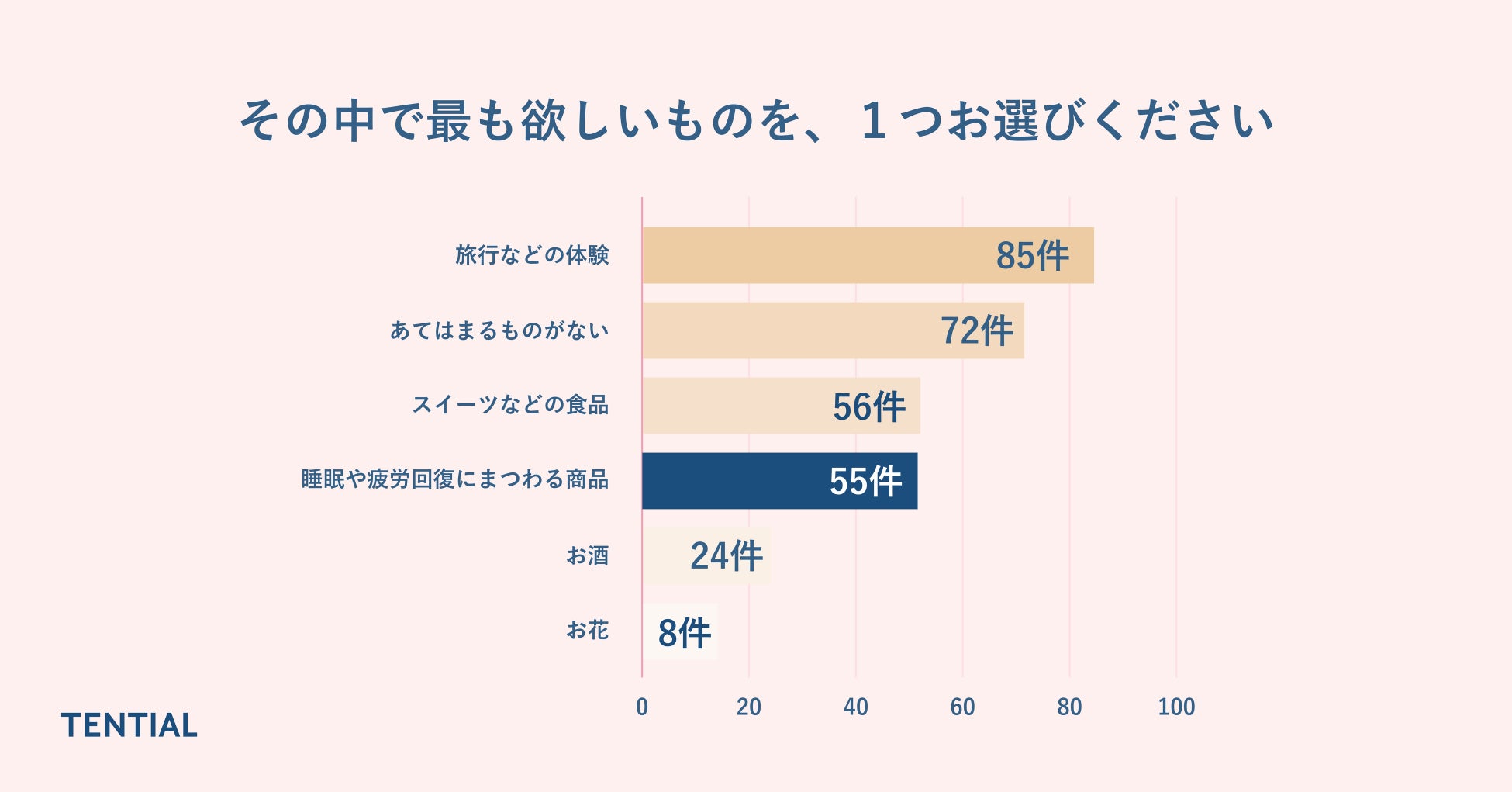 「最も欲しいギフト」をひとつだけ選んでもらった設問でも、「睡眠改善アイテム」は「旅行」「スイーツ」と並ぶ上位に入りました。単なる“あったら嬉しい”ではなく、“今いちばん欲しい”と感じる人が多いことがうかがえます。休息やコンディショニングに対する関心の高まりが、ギフト選びにも反映されていることが明確になりました。