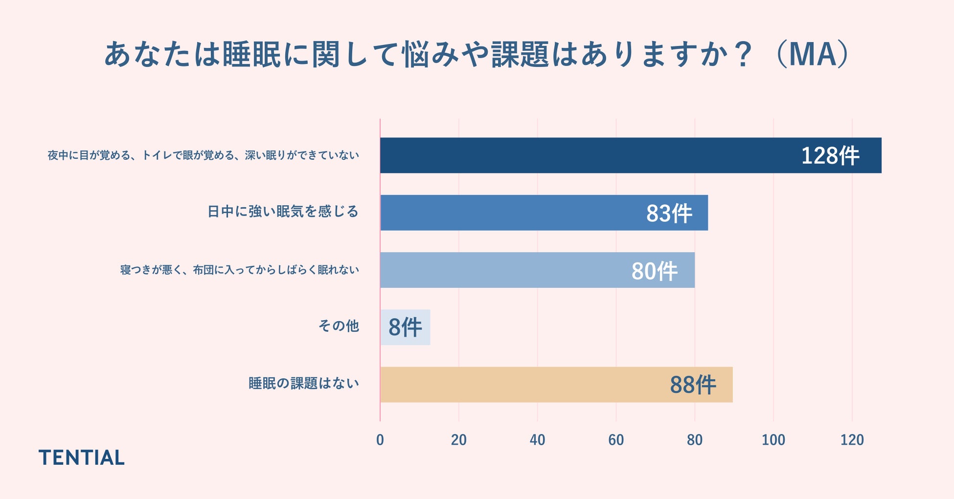 睡眠に関する悩みとして最も多かったのは「夜中に目が覚める、深い眠りができていない」で、全体の約4割が該当。次いで「寝つきの悪さ」や「日中の眠気」が続き、睡眠への課題を感じている人が多数いることが読み取れます。一方で「睡眠の課題はない」との回答も88件にのぼり、睡眠の悩みには個人差があることも浮き彫りとなっています。