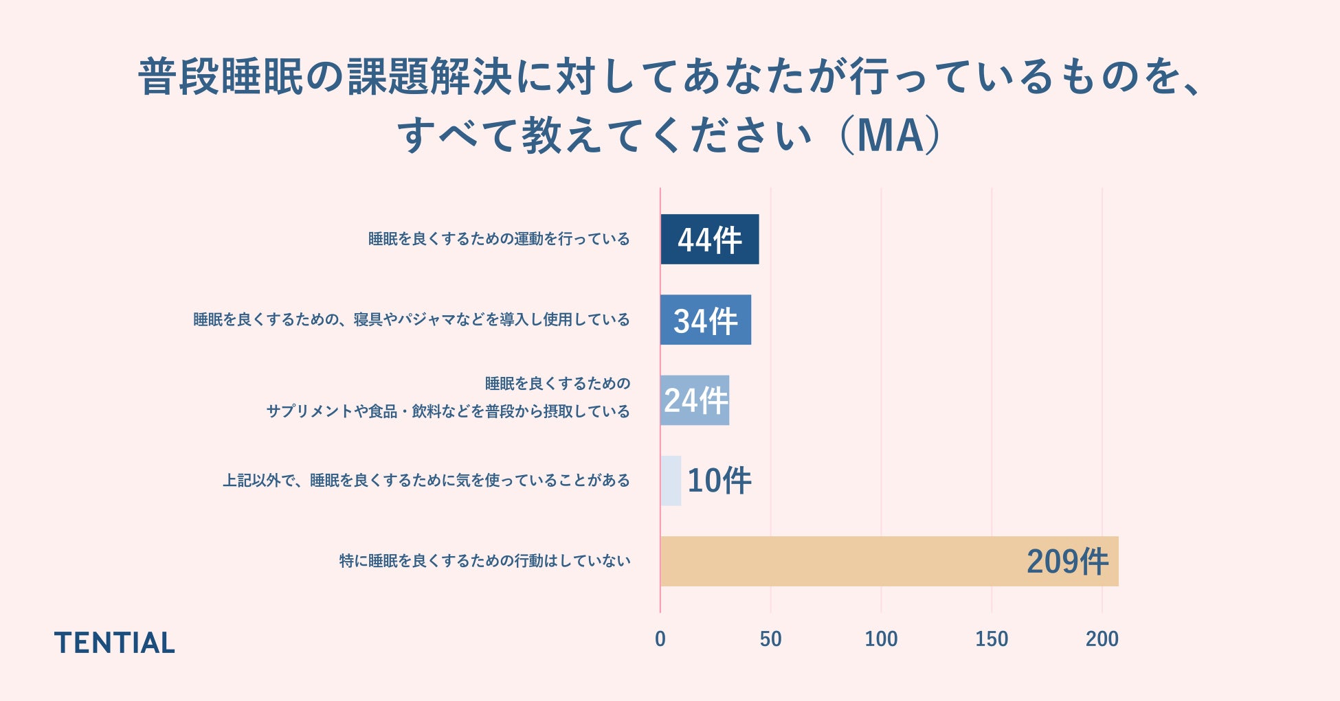睡眠を改善したいと回答した人は9割近くに上ったものの、実際に何らかのアクションをしている人は少数派でした。「睡眠のために運動している」「寝具やパジャマを選んでいる」などの行動が一定数見られる一方で、“特に行動していない”の回答が回答者の約7割となる209件にのぼり、改善意欲と実行の間にギャップがあることが読み取れます。日常的に取り入れやすい“きっかけ”づくりが、今後ますます求められています。