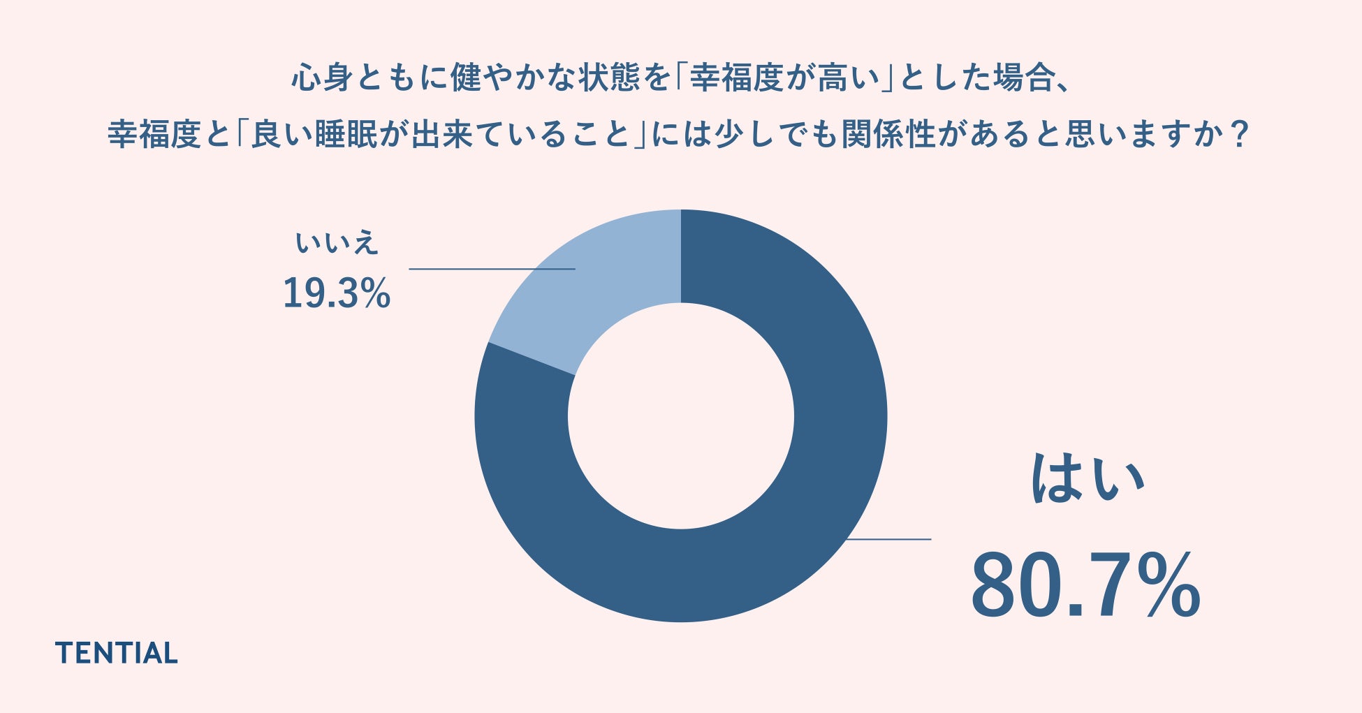 「心身ともに健やかな状態=幸福度が高い」とした上で、「良い睡眠と幸福度には関係がある」と答えた人は80.7%にのぼりました。良質な睡眠が日々の幸福感と深くつながっていることが明らかとなり、改めて“眠りの質”の重要性が浮き彫りになりました。