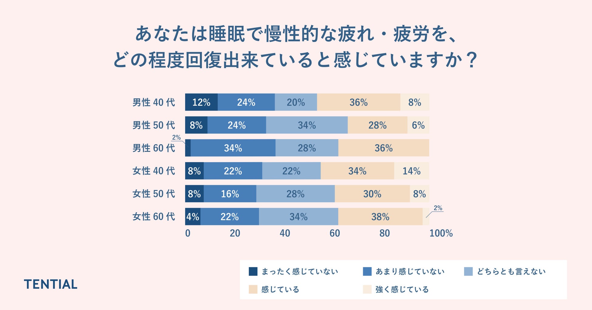 「睡眠で疲労が回復できている」と感じている人は全体の4割にとどまり、中間層を含めると、