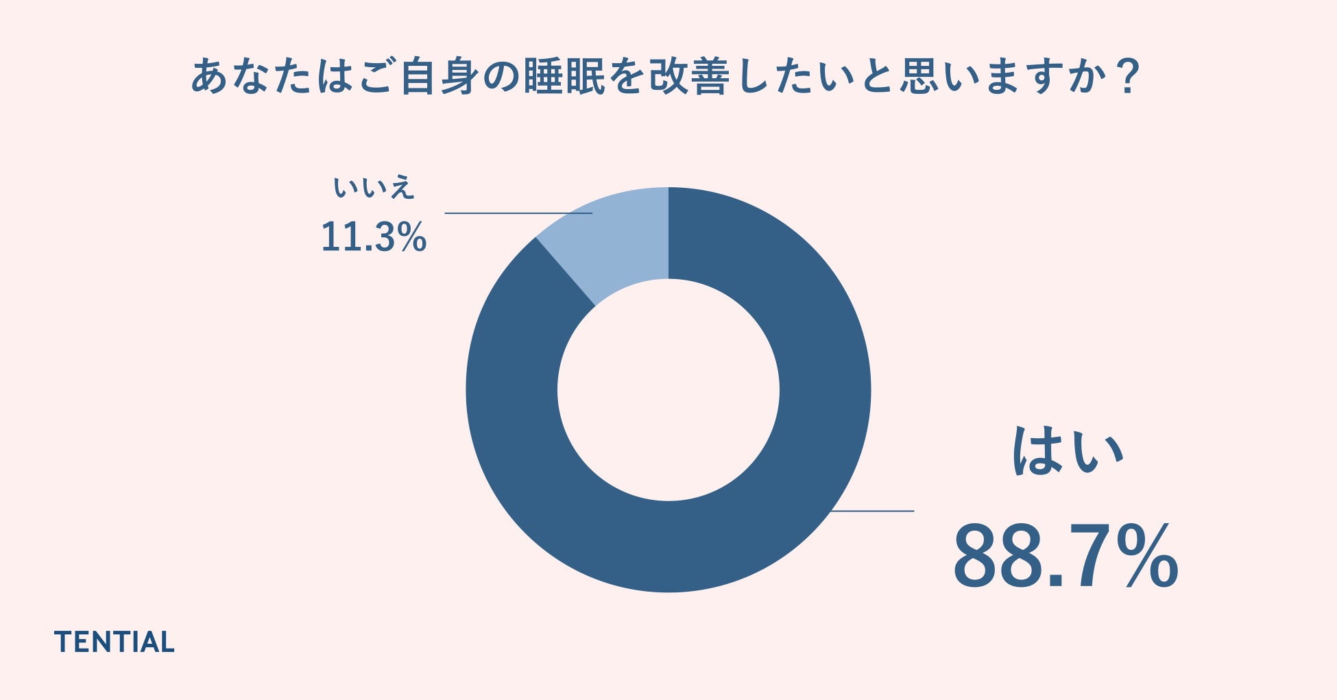 自身の睡眠について「改善したい」と回答した人は88.7%と、非常に高い割合となりました。寝つきの悪さや夜中の覚醒、日中の眠気といった課題とあわせて、多くの人が“睡眠に満足しておらず、改善意欲がある”ことが浮き彫りになっています。