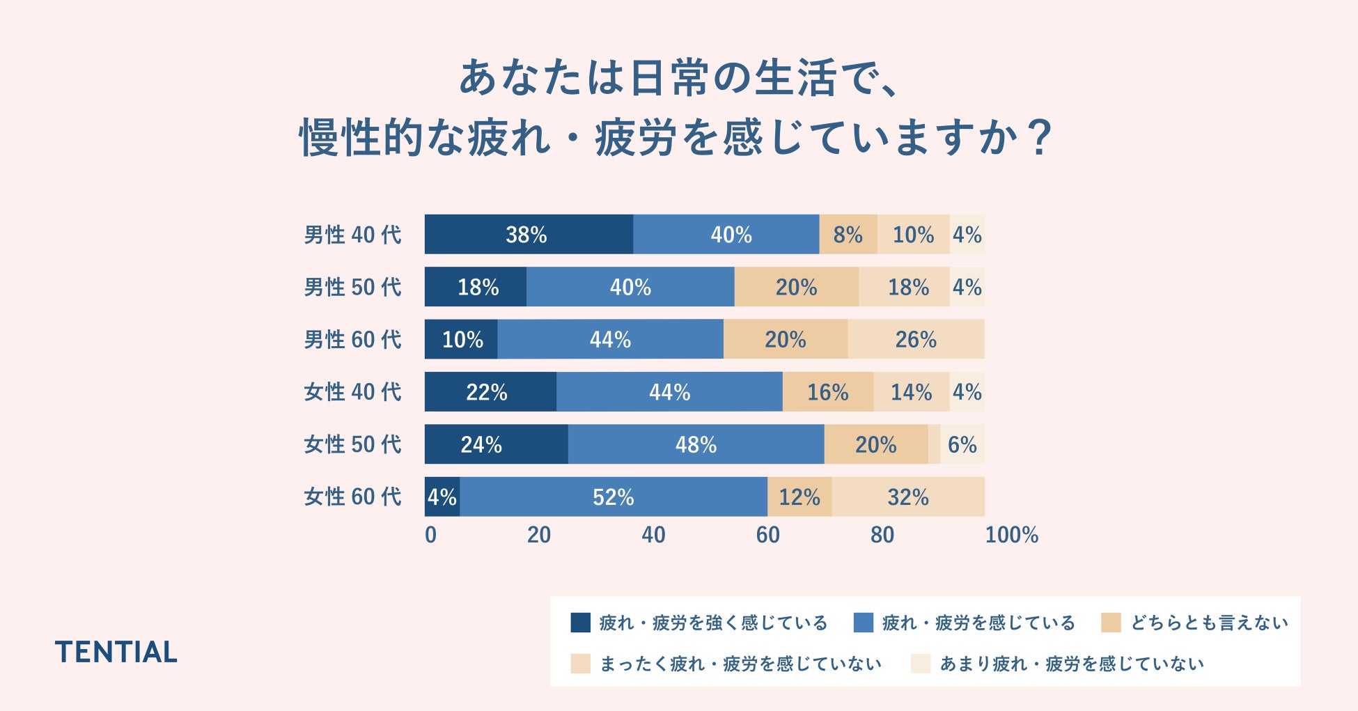 「日常生活で疲れをどの程度感じているか」という問いに対し、全体の64%が日常で慢性的な疲れ・疲労を「強く感じている・感じている」と回答。なかでも、40代男性が最も“疲労を強く自覚”していることが判明しました。