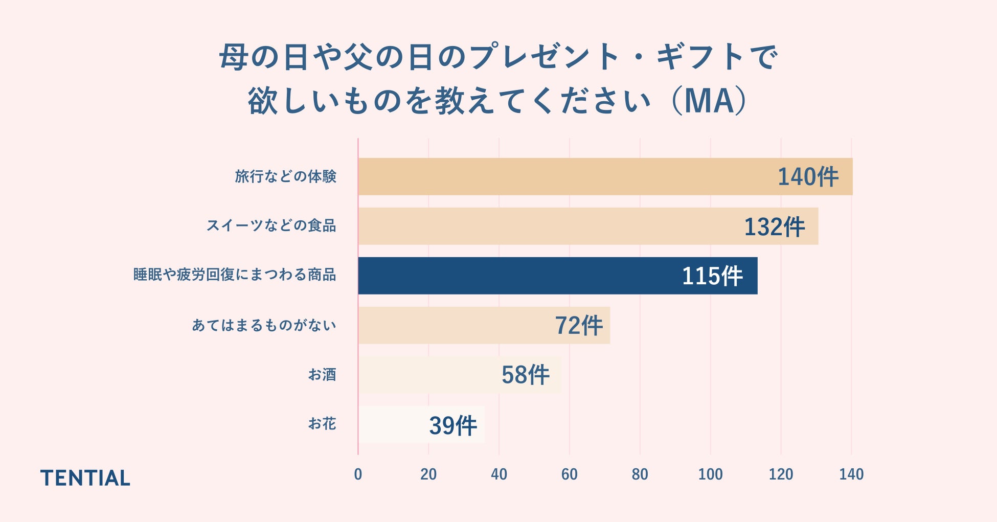 母の日・父の日に「もらって嬉しいギフト」として、近年人気を集めていた「旅行などの体験」や「スイーツなどの食品」に加え、「睡眠改善アイテム」が同水準の支持を集めました。心や体を癒やす時間を重視する傾向が強まるなか、“健康に気遣うギフト”を贈るという新しい感謝のかたちが広がりつつあります。睡眠が幸福感やコンディションと密接に関わるものとして認識され始めており、“休息そのもの”を届ける選択肢が支持を集めていることが読み取れます。