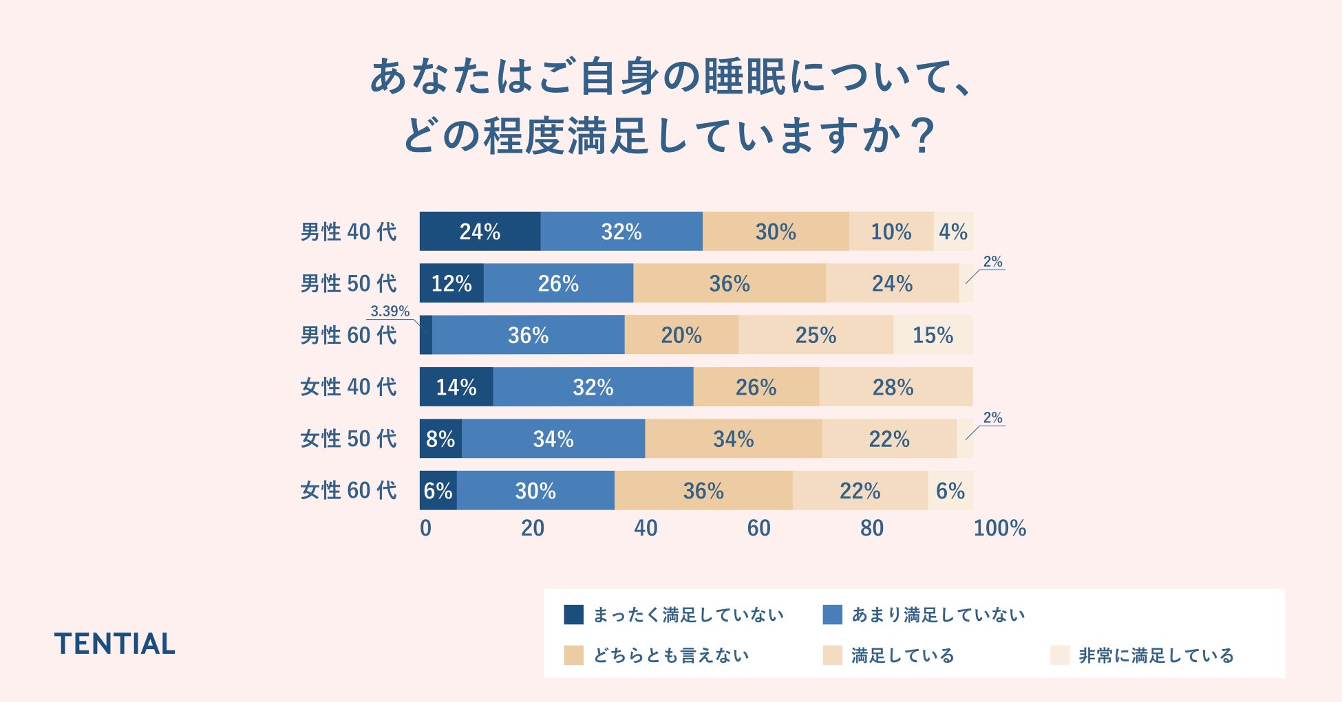 睡眠満足度に関しては、男性40代で「まったく満足していない/満足していない」との回答が56%にのぼり、全体で最も高い結果となりました。次いで、女性40代(46%)・女性50代(42%)も満足度が低い傾向が見られます。いずれも「忙しさ」「年齢が上がる」「日常のストレスが増える」など、睡眠環境の乱れが影響している可能性が考えられます。