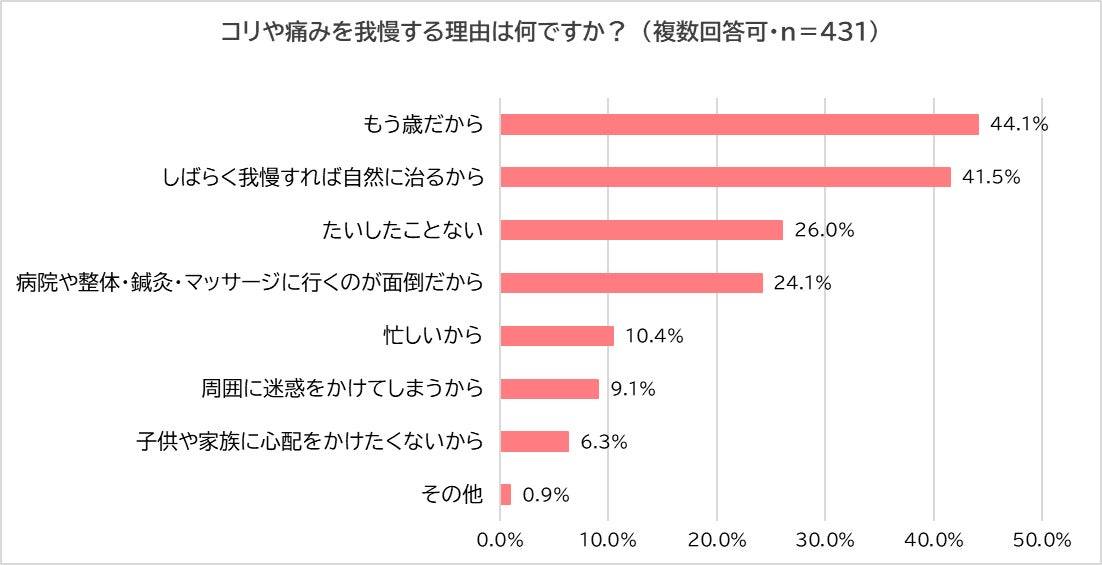 続いて、「コリや痛みを我慢することがある」と回答した431名に、「コリや痛みを我慢する理由」を尋ねました。「もう歳だから」(44.1%)や「しばらく我慢すれば自然に治るから」(41.5%)と答えた母親4割以上を占め、「たいしたことないから」(26.0%)や「病院や整体・鍼灸・マッサージに行くのが面倒だから」(24.1%)といった理由も目立ちました。また、「周囲に迷惑をかけてしまうから」(9.1%)や「子供や家族に心配を掛けたくないから」(6.3%)と答える母親も一定数存在しました。