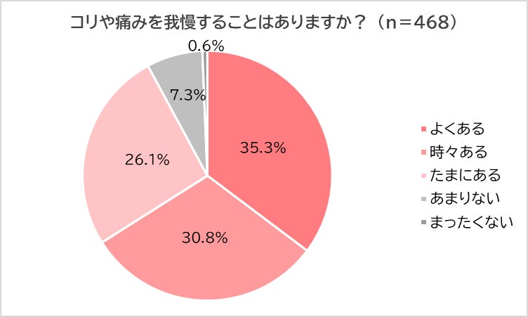 次に、「日常的にコリや痛みを感じる」と回答した468名に対して、「コリや痛みを我慢することはあるか?」と尋ねました。その結果、最多は「よくある」(35.3%)で、次いで「時々ある」(30.8%)、「たまにある」(26.1% )、「あまりない」(7.3%)、「まったくない」(0.6%)となりました。このことから、日常的にコリや痛みを感じるほとんどの母親が、そのコリや痛みを我慢していることが判明しました。