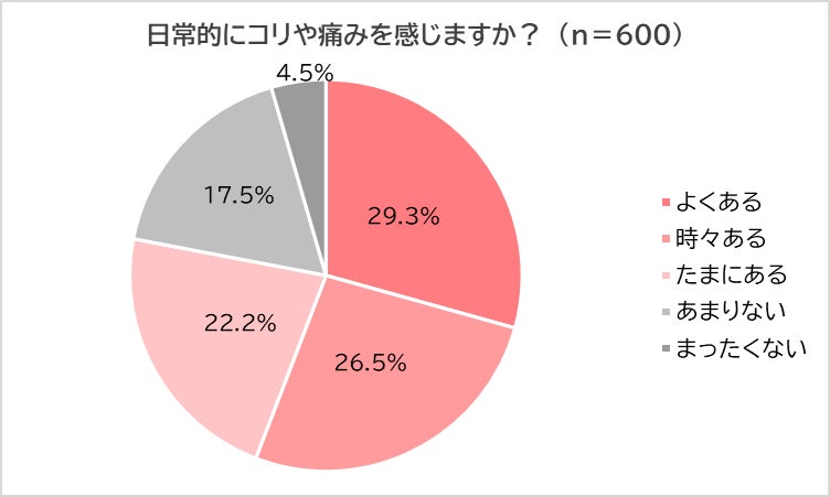 50歳以上80歳未満の全国の母親に「日常的にコリや痛みを感じるか?」と尋ねたところ、「よくある」(29.3%)、「時々ある」(26.5%)、「たまにある」(22.2%)、「あまりない」(17.5%)、「まったくない」(4.5%)との結果が得られ、約8割(78.0%)の母親が日常的にコリや痛みを感じていることが明らかになりました。