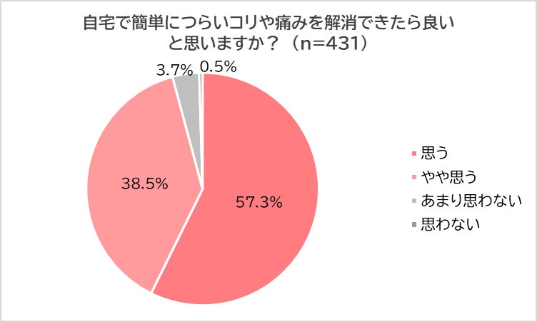 さらに、「自宅で簡単につらいコリや痛みを解消できたら良いと思うか?」と尋ねたところ、約6割(57.3%)が「思う」、約4割(38.5%)が「やや思う」と回答しました。