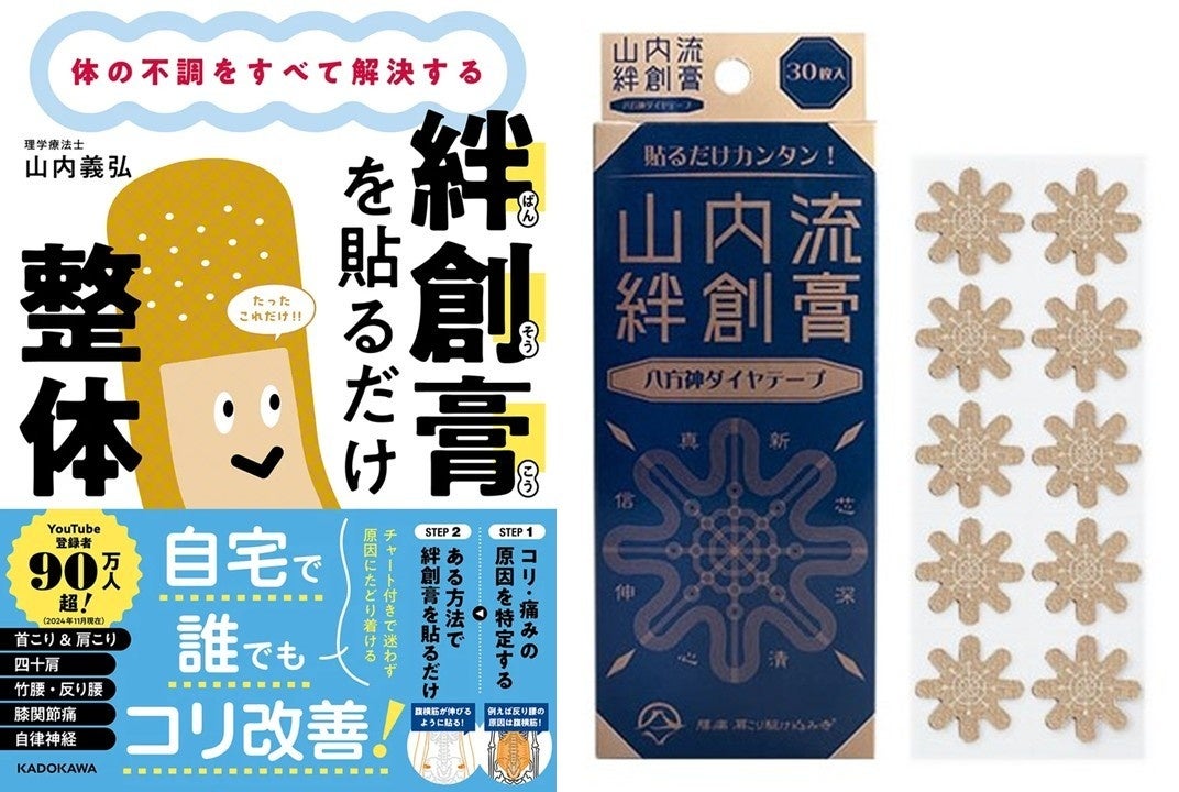 そして、2つ目は、「絆創膏貼るだけシリーズ」の書籍化に伴い、山内自身が開発した「山内流絆創膏 八方神ダイヤテープ」(税込 3,490円)。解剖理論に則った8方向への構造刺激により、上下・左右・斜めのあらゆる方向へ独自の刺激を与えることで、さまざまな角度についている筋肉や筋膜、腱、ファシアなどの組織に働きます。