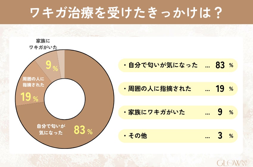 ワキガ治療を受けた人の8割が治療を受けたきっかけを「自分で匂いが気になったから」であると答えています。