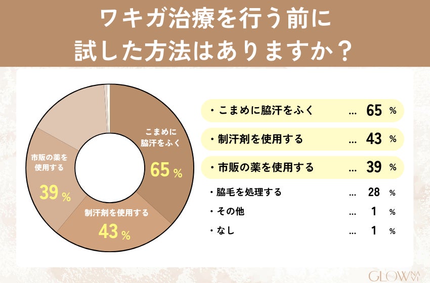 治療前にも「こまめに脇汗を拭く」「制汗剤を使用する」「市販の薬を使用する」等の対策をしていた人が多くいました。それでもなお、匂いが気になってしまう場合には治療を受けることをおすすめします。