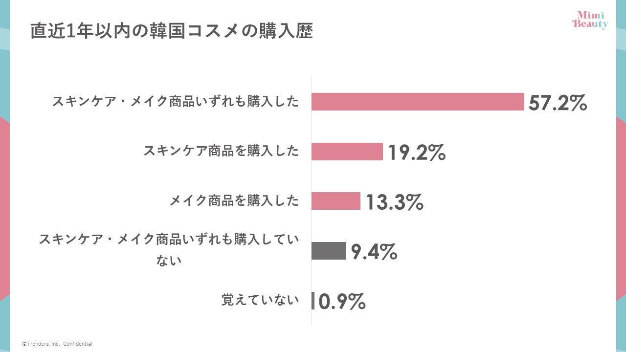 はじめに、購入実績を調査したところ、直近1年以内に韓国コスメ(韓国ブランドのスキンケア・メイク商品いずれか・もしくは両方)を購入した人は全体の約90%にのぼりました。このうち57.2%はスキンケア・メイク両方とも購入しており、カテゴリ問わず韓国コスメの人気がうかがえる結果となりました。