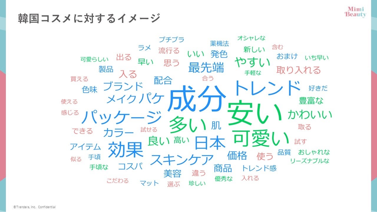 また、韓国コスメに持っているイメージを自由回答で聞いたところ、「話題の成分が豊富」「安い」「効果が高い」「パッケージが可愛い」「トレンド最先端」といったキーワードが多く上がりました。