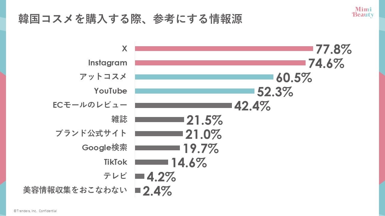 続いて、韓国コスメを購入する際に参考にしている情報源としては、「X」および「Instagram」が70%以上となり、SNSから得た情報を参考にしているユーザーが多いことが分かりました。次いで「アットコスメ」「YouTube」も半数以上のユーザーが参考にしている一方、「ブランド公式サイト」を参考にする人は21.0%にとどまり、メーカー発信の情報よりも第三者のクチコミがより参照されているという結果となりました。