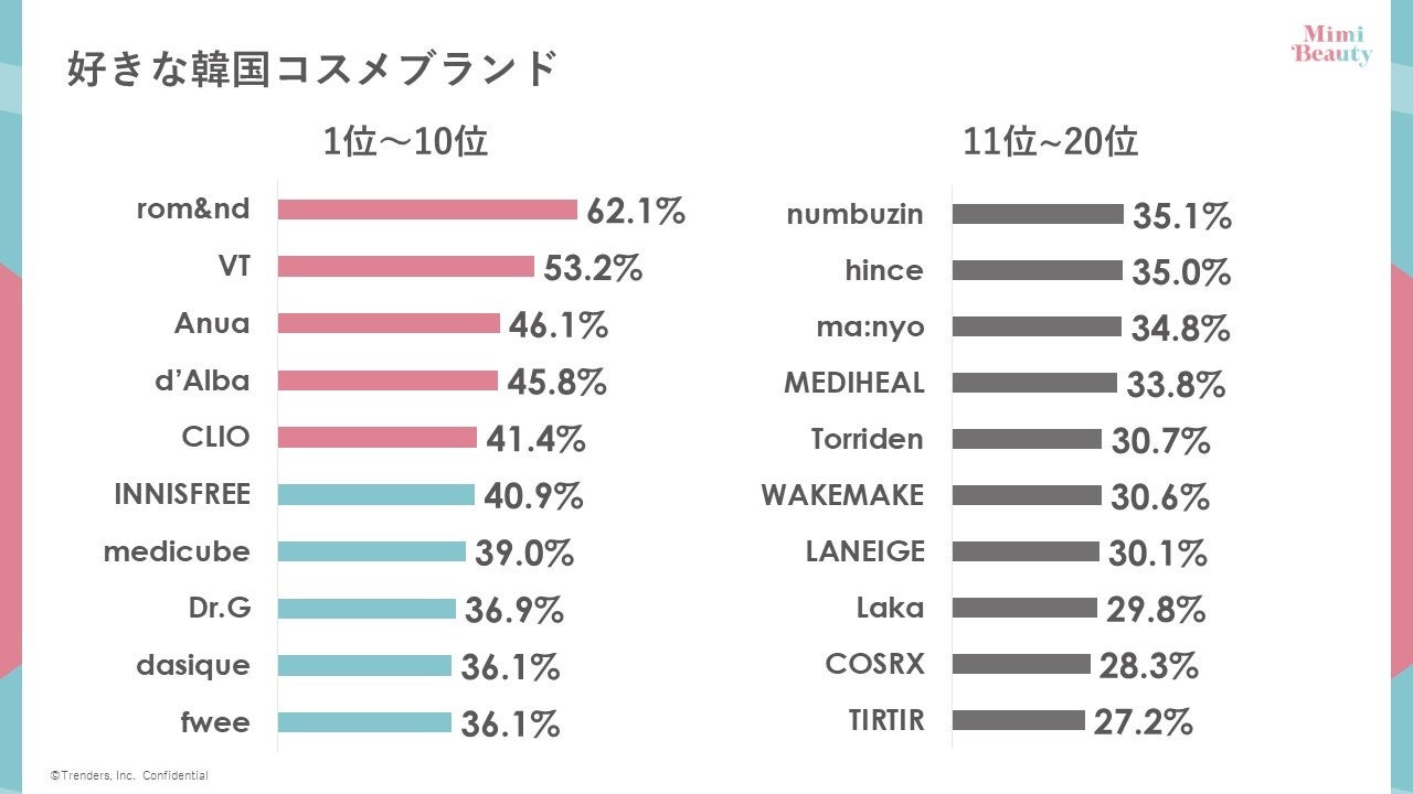 最後に、「好きな韓国コスメブランド」を聞いたところ、20位までの結果は以下の通りでした。62.1%のユーザーに選ばれた「rom&nd」はSNSでも常に話題となっており、Mimi Beautyが半期に1回発表するバズコスメも過去に複数回受賞しています。