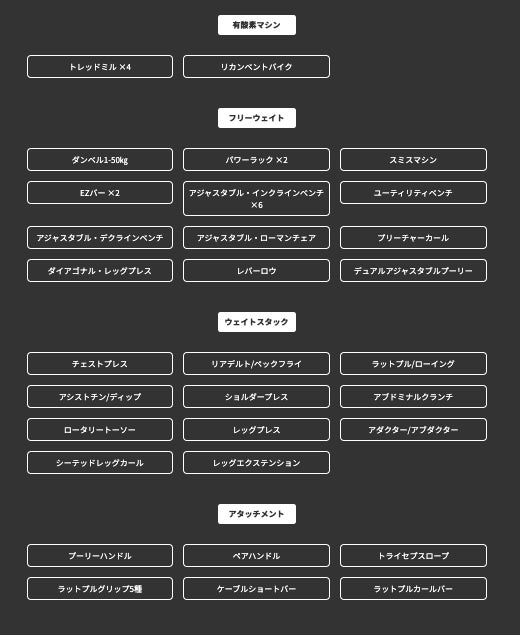 リーズナブルな価格ながら、使い勝手にこだわった本格的なマシンを多数完備! 「この価格でこのマシン設備は嬉しい」と感じていただける、価格以上の満足感を目指しています。