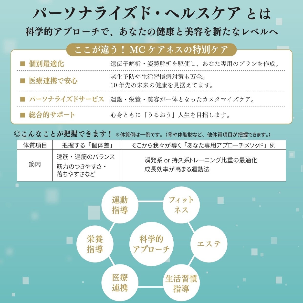 本プログラムでは、遺伝子分析(※1)をはじめ、姿勢解析や体組成測定、パワープレートなどの各種計測データの結果をもとに、運動・美容・栄養の観点からお客様一人ひとりに最適なサポートプランをご提案いたします。それぞれの体質や目標に寄り添いながら、運動・美容・食事を組み合わせた包括的な健康づくりを支援し、“あなた専用”のプログラムで、これまで以上に充実したケアをご提供いたします。
