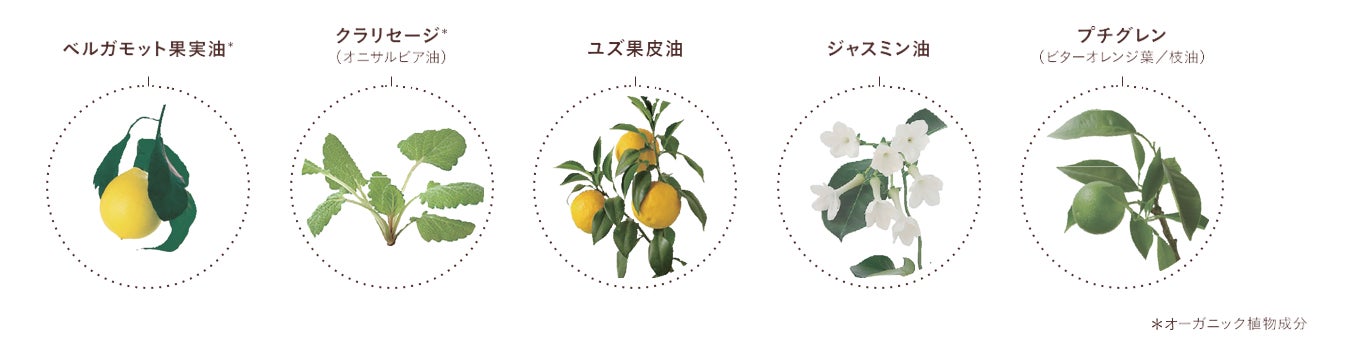 きらめくように弾けるシトラスに、クラリセージ、ジャスミンが甘やかに溶け合って、心はずむ幸福感をもたらします。