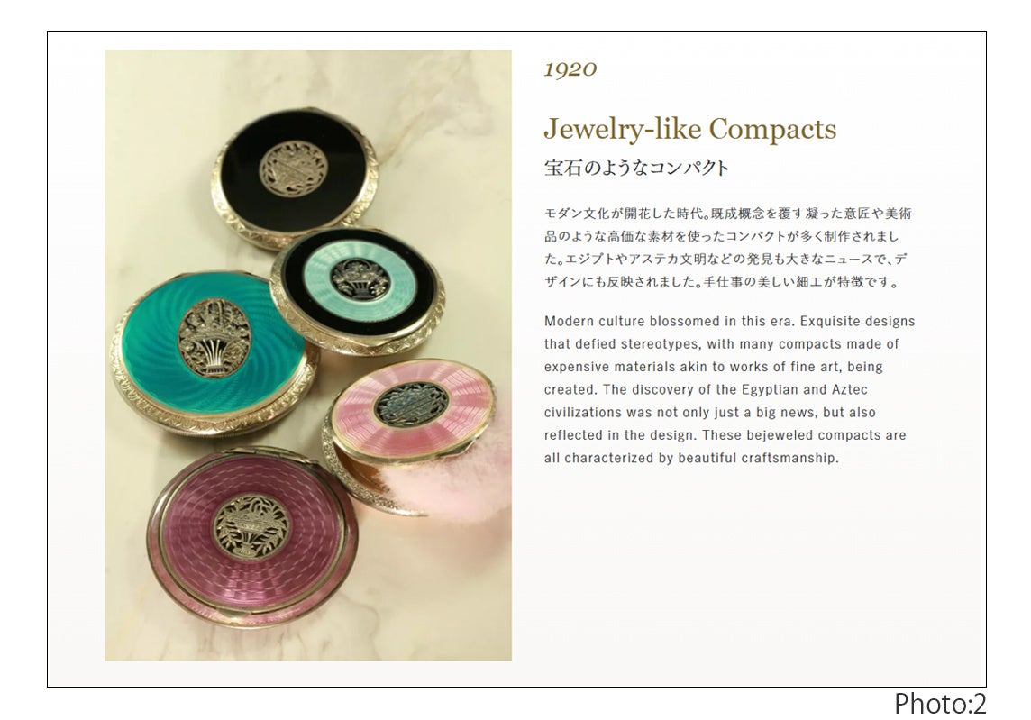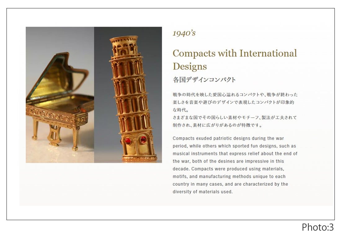 トップページでは、コンパクトコレクションの社会と文化および化粧との関係を紹介しています。コンテンツ内容は、時代背景に基づいた7つのテーマに分かれており、時代に沿って変化してきたコンパクトの役割についても知ることができます。(Photo:2,3)