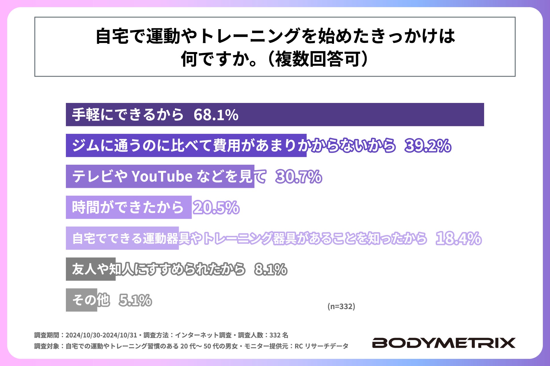 また、「自宅で運動やトレーニングを始めたきっかけは何か」を尋ねる設問の回答で多かったのは、1位が「手軽にできるから」で68.1%、2位が「ジムに通うのに比べて費用があまりかからないから」で39.2%、3位が「テレビやYouTubeなどを見て」で30.7%となりました。この結果から、自宅での運動やトレーニングを始めたきっかけとしては「手軽さ」が最も大きいことがわかりました。