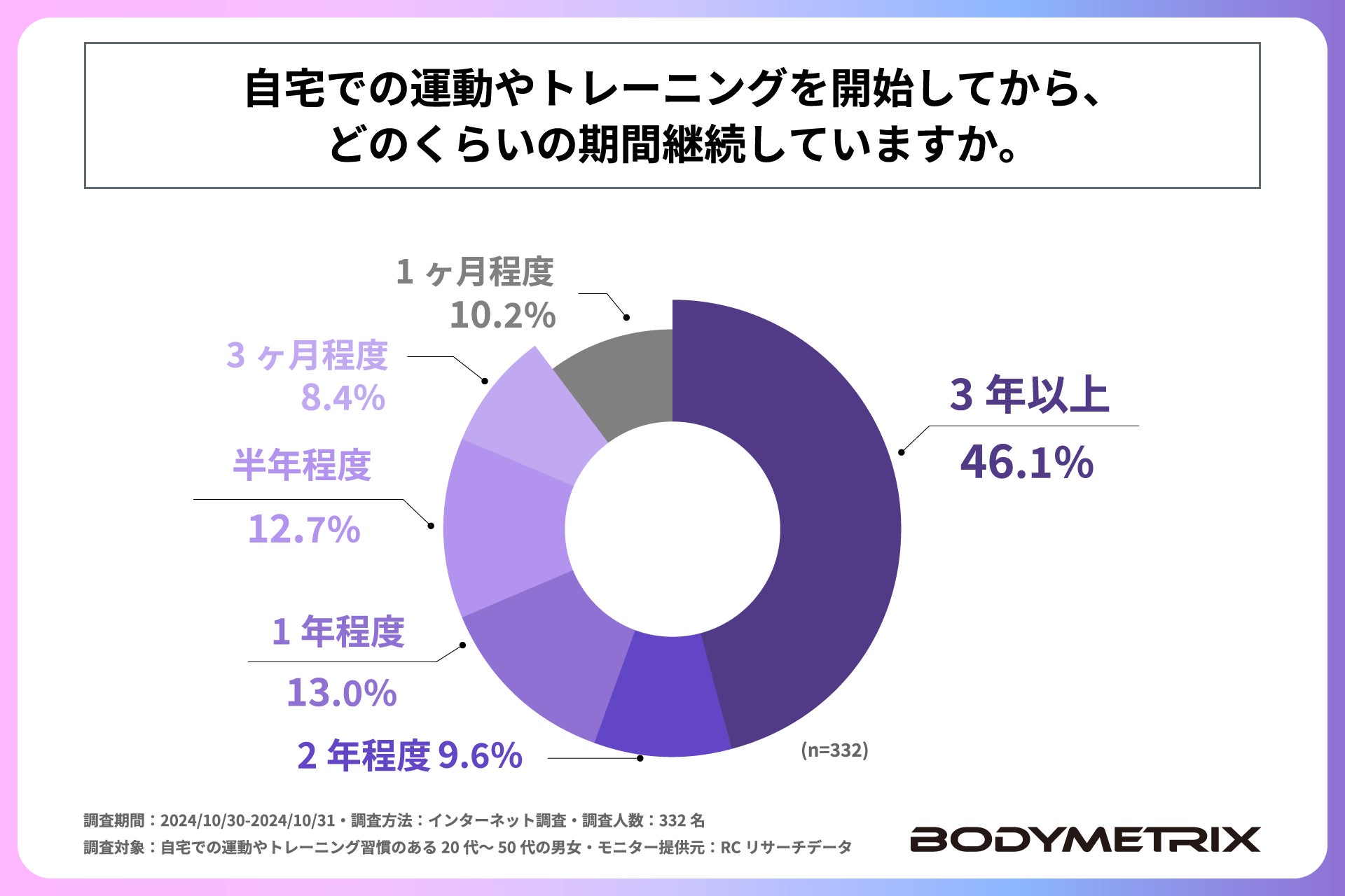 続いて「自宅での運動やトレーニングを開始してから、どのくらいの期間継続しているか」を問う設問への回答では、1位が「3年以上」で46.1%、2位が「1年程度」で13.0%という結果となりました。「3年以上」が最も多い回答となり、この結果から、コロナ禍に自宅での運動やトレーニングを開始された方が多いことが明らかになりました。
